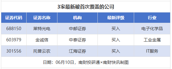 首次覆盖方面,6月10日,券商共给出了3次首次覆盖,其中莱特光电获得中邮证券给予“买入”评级,金诚信获得中泰证券给予“买入”评级,托普云农获得江海证券给予“买入”评级。